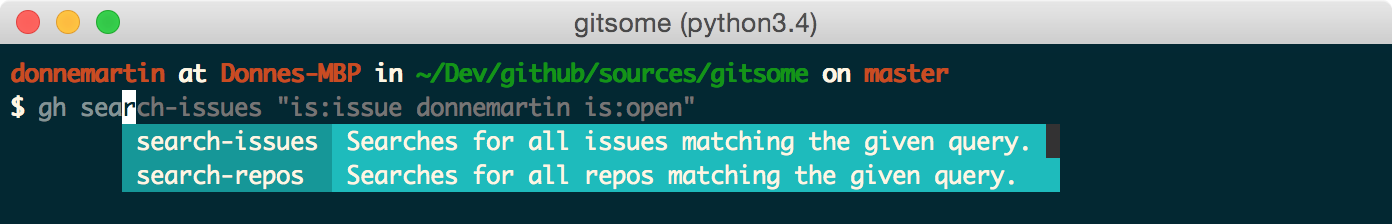 Once installed, run the optional gitsome autocompleter with interactive help: